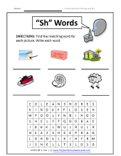 "Sh" Words - Find the words in the puzzle that match each picture. Do not lose sight of the chunks of consonants in the matrix of letters.